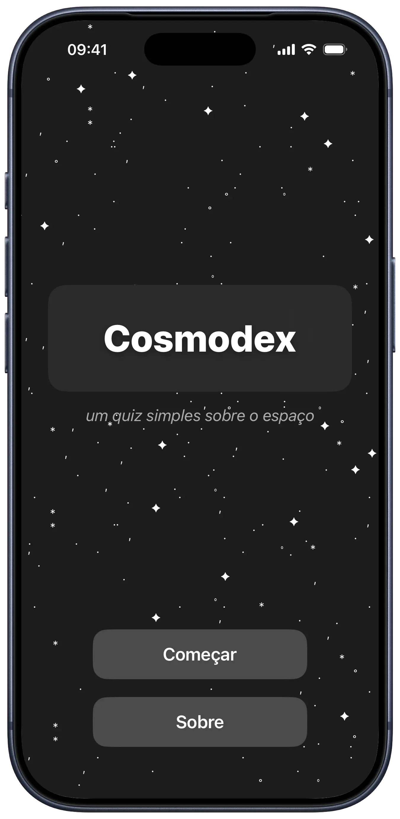 considering cosmodex's nature as an exercise in basic UIKit concepts and also the chosen theme - a quiz about the universe - i opted for a minimalist and dark design. this not only complements the space theme, but made the design process quite simple and effective.