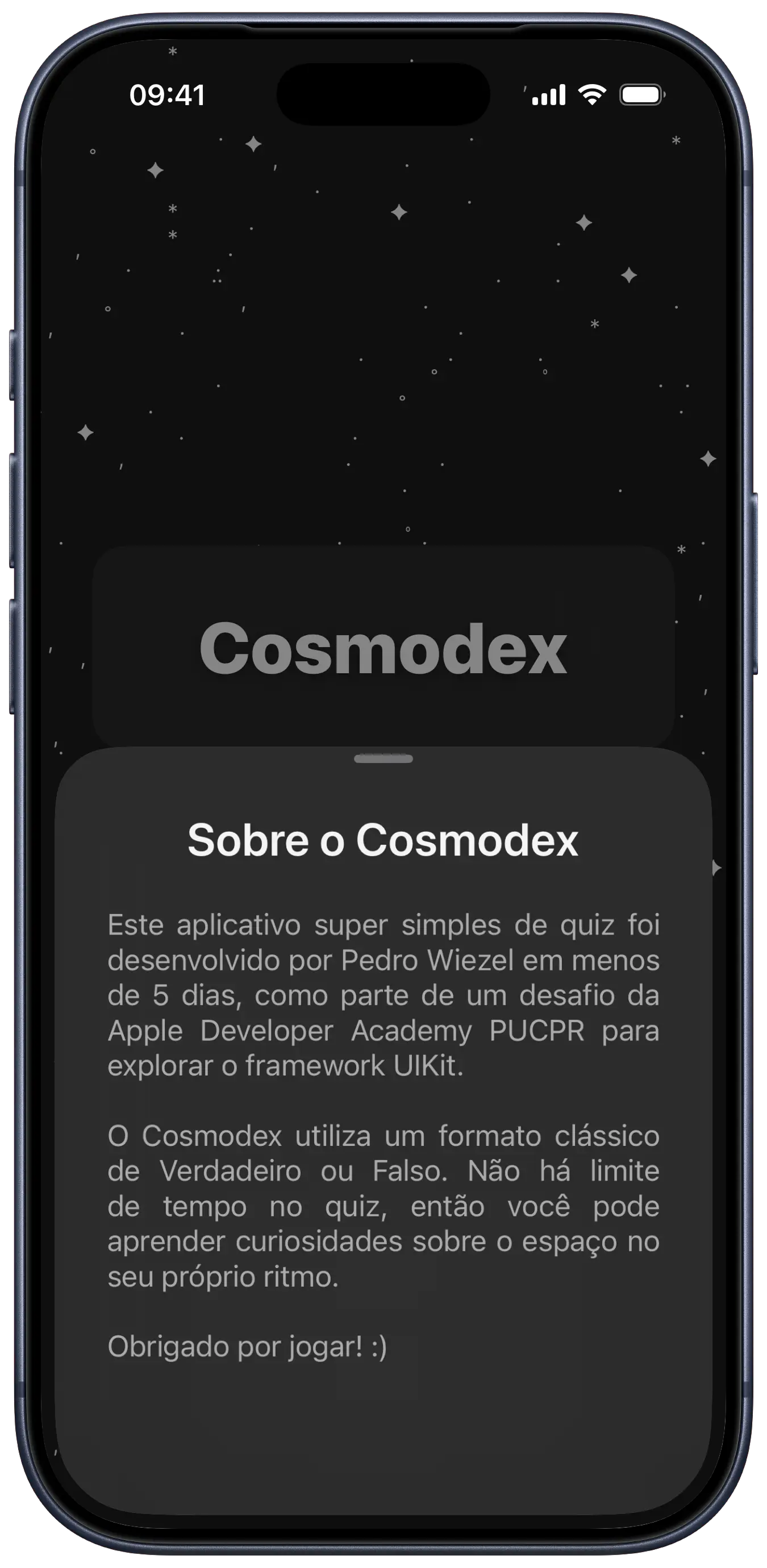 i developed cosmodex in five days during an UIKit basics challenge at the Apple Developer Academy. the project was an opportunity to learn UIKit in a programmatic manner, avoiding the use of Storyboards, and to grasp the fundamentals of positioning elements on the screen, navigation between views, and manipulation of basic data (in this case, the quiz score).