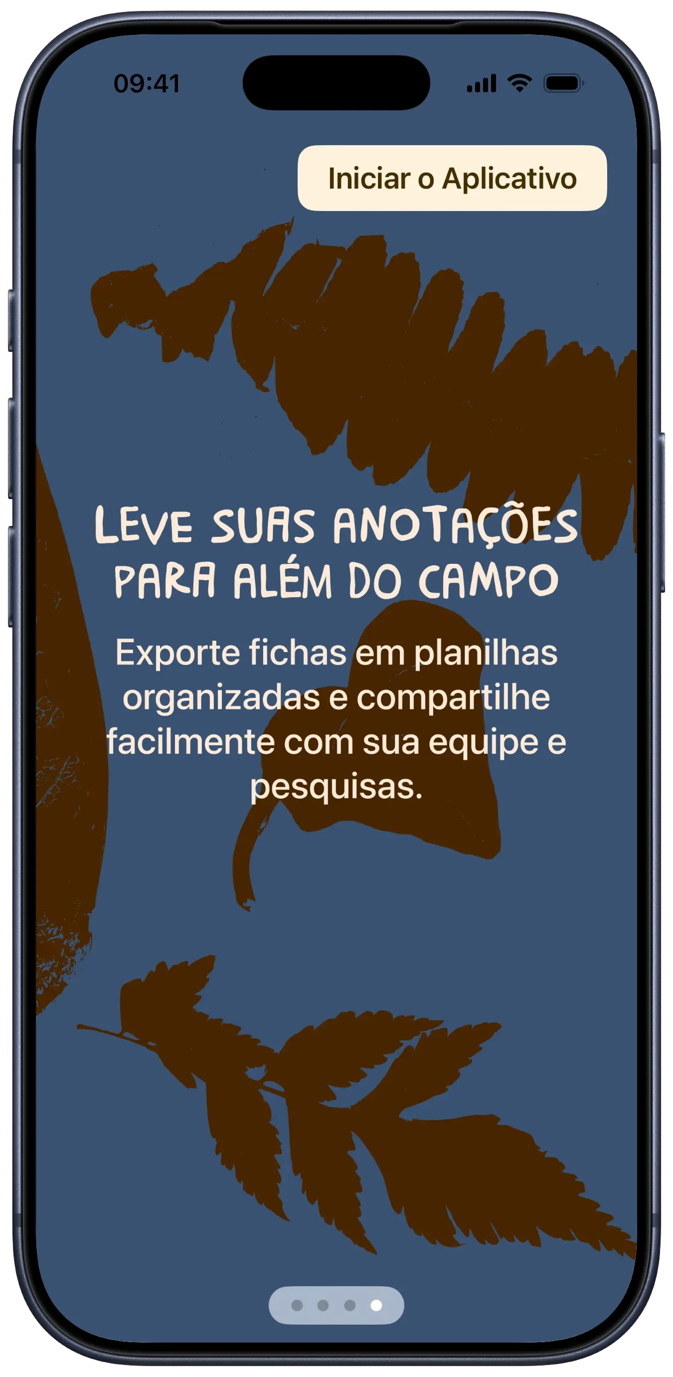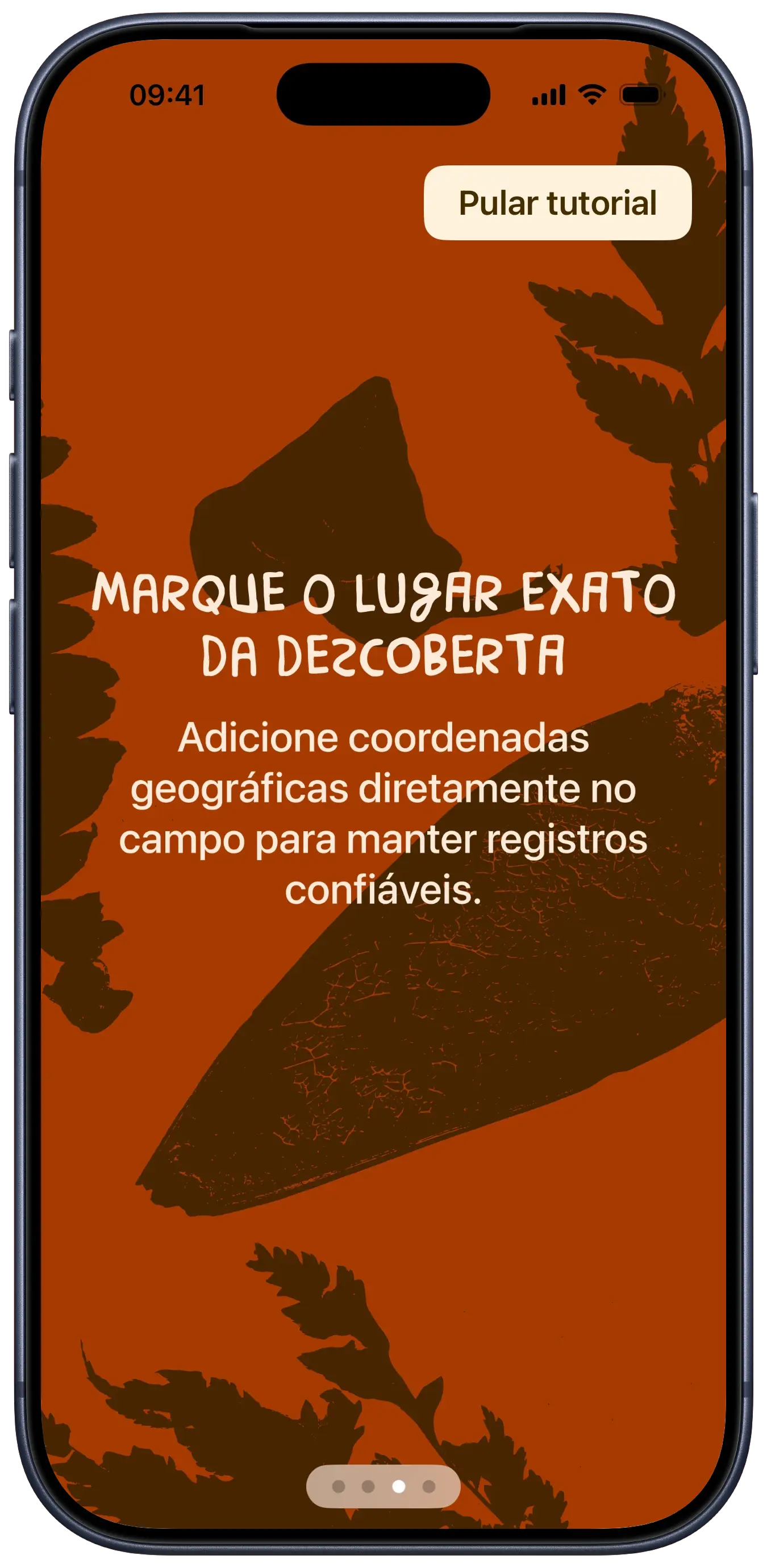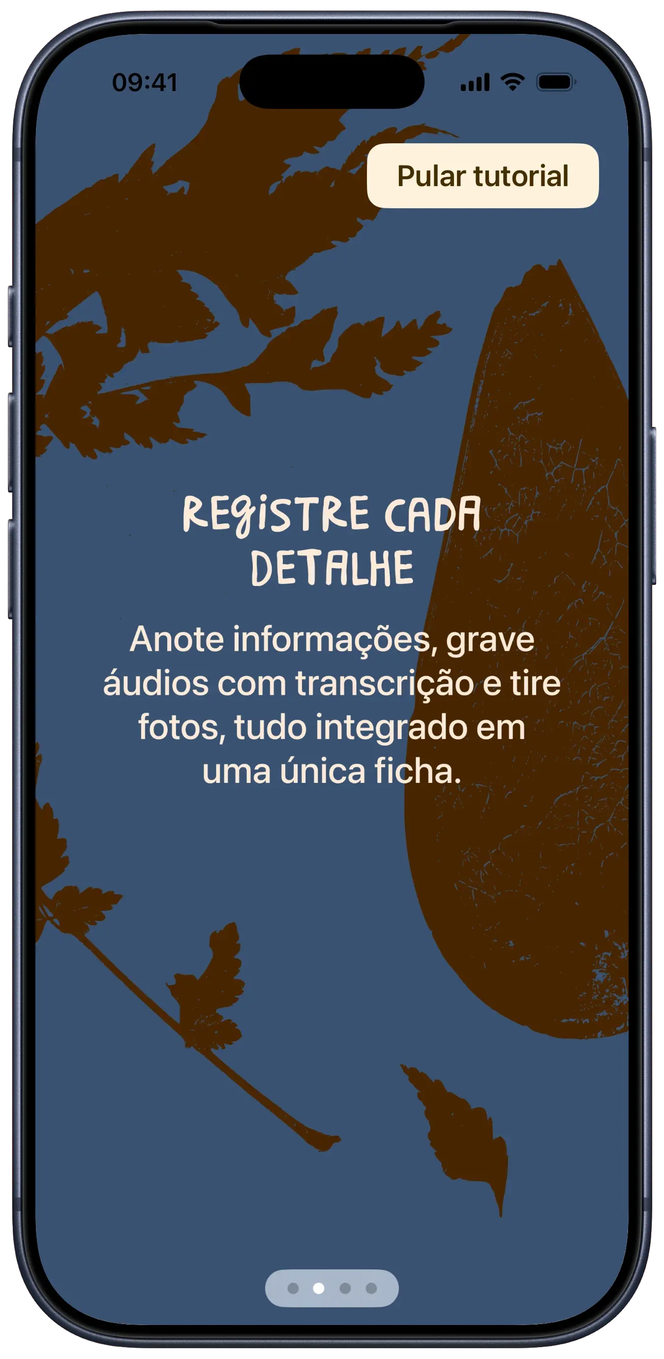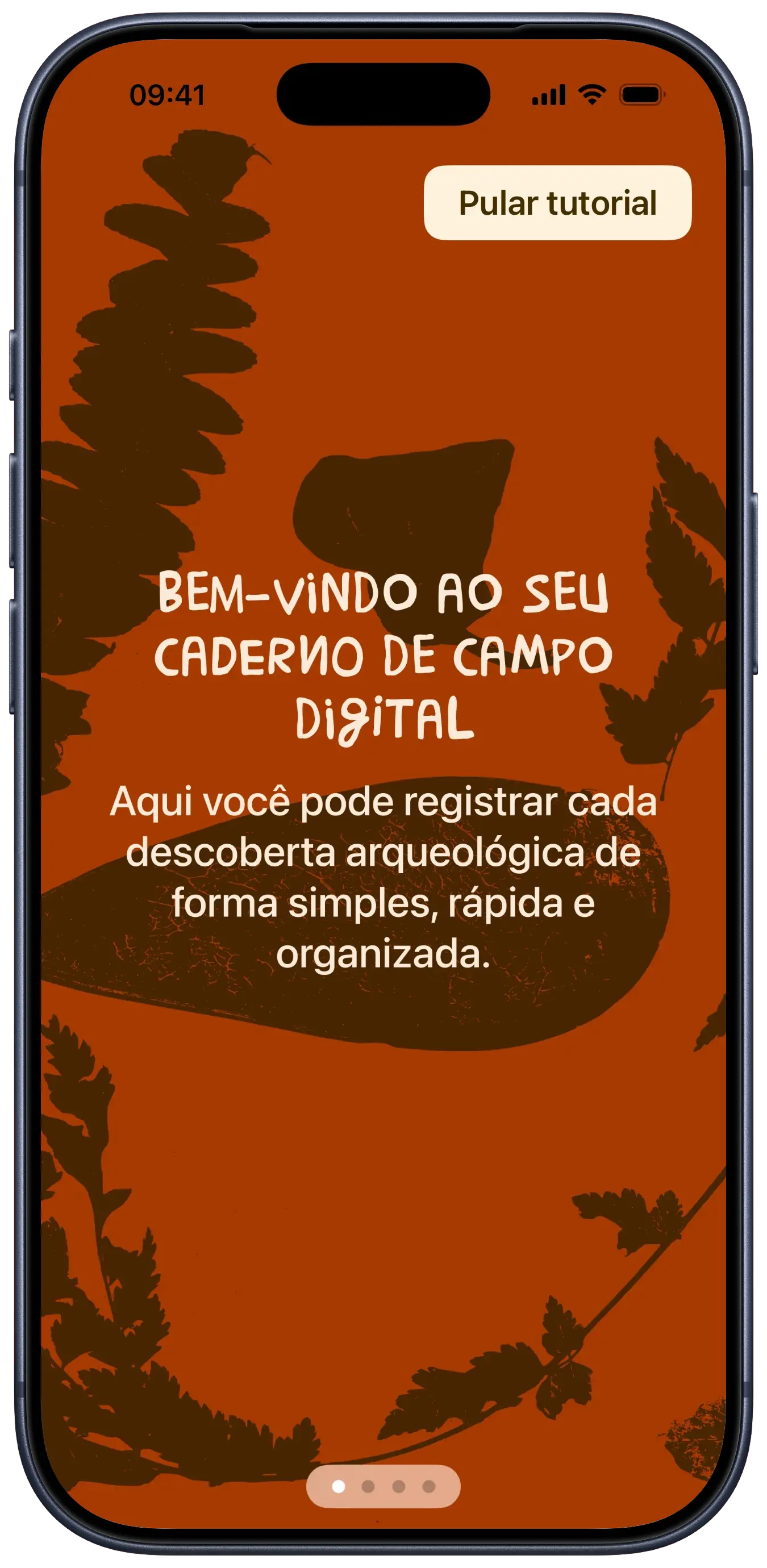 we scanned various leaves and small plants, whose silhouettes were vectorized and used as ornaments and visual details in the onboarding and the app logo, reinforcing the connection with nature and the archaeological environment.