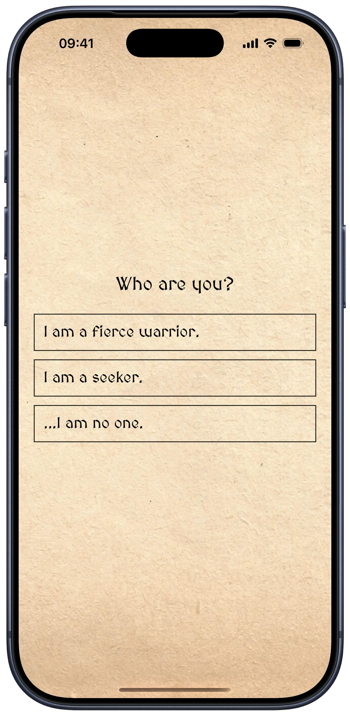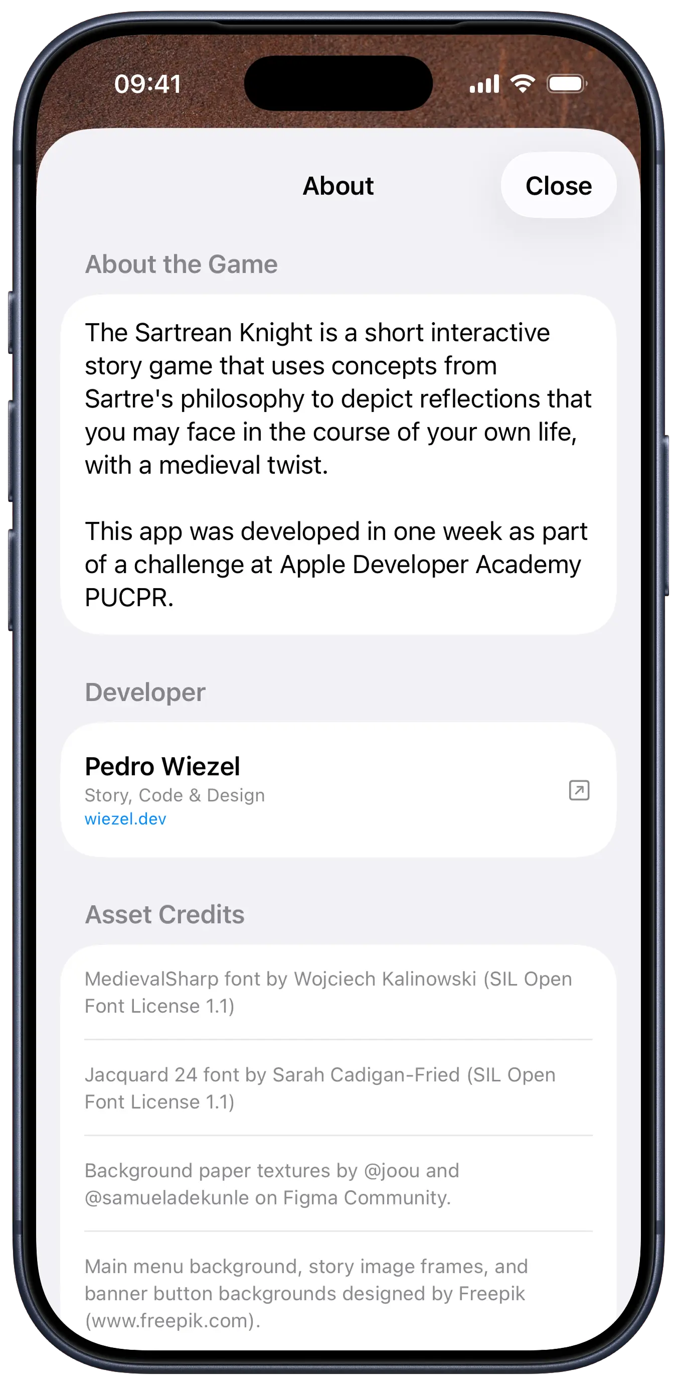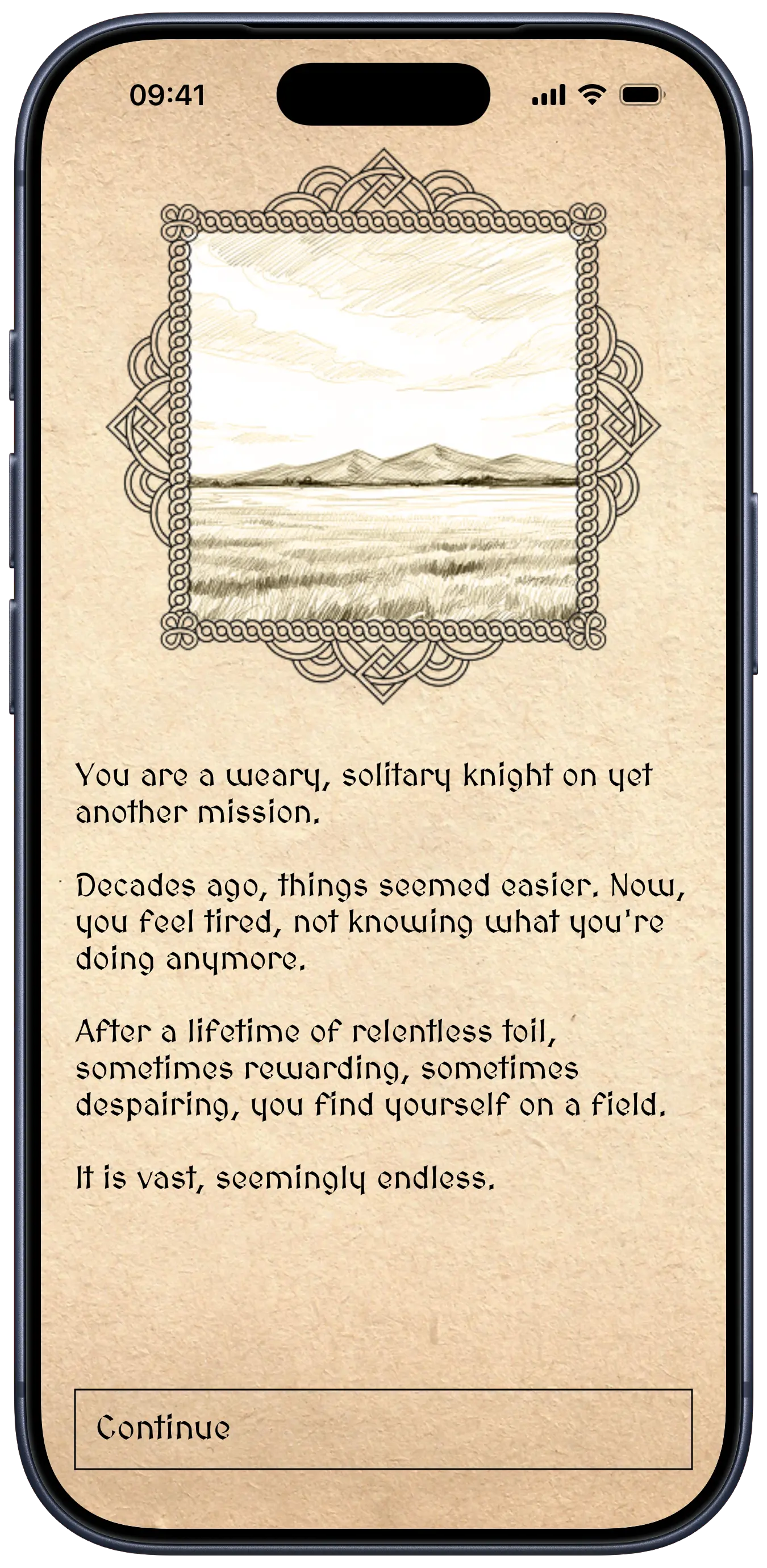 i developed the sartrean knight in one week during the initial phase of my experience at the Apple Developer Academy. the project was an opportunity to explore interactive storytelling and the design of meaningful choices.